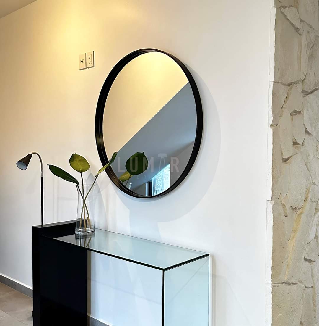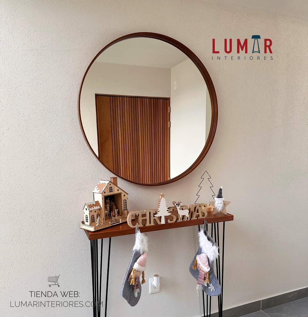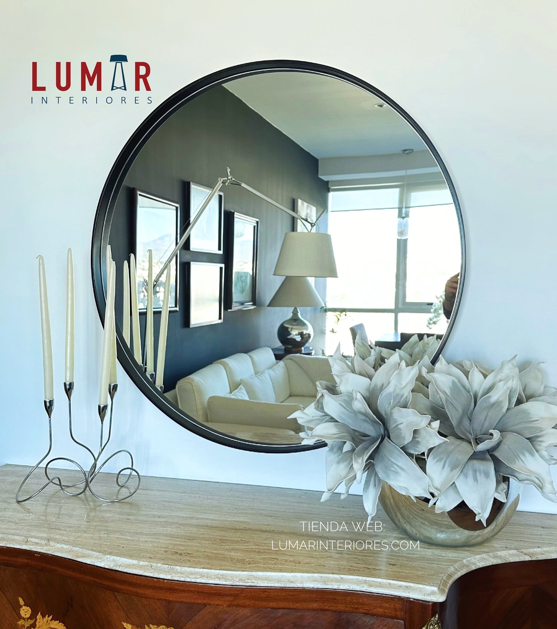 Espejos redondos fabricados en madera. Dos medidas 120cm y 100cm. Pintura a base poliuretano. Espejo con marco tipo imitación de solera en madera.