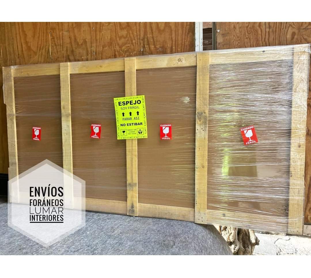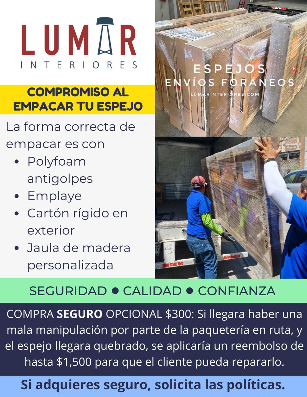En LUMAR Interiores nuestro compromiso con el cliente es enviar los espejos con el mejor empaque del mercado, un empaque especializado de madera y plástico protectores para garantizar la llegada de tu espejo en tu hogar. Sin embargo ofrecemos una extra protección con costo de $300. En casa de ser utilizada se reembolsan hasta $1,500 para reposición de luna en tu ciudad destino.